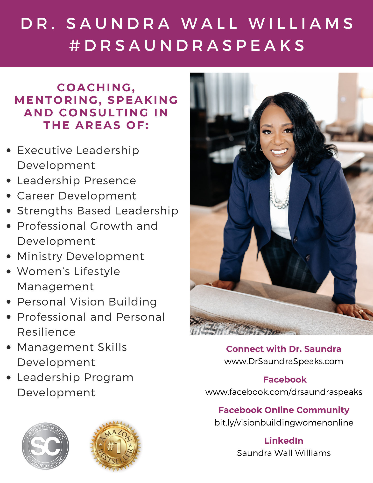 Dr. Saundra's mission is to provide women with the tools to grow personally, spiritually, and professionally and eliminate those barriers that are holding them back so that they can show up and do the work to reach their next level of success.